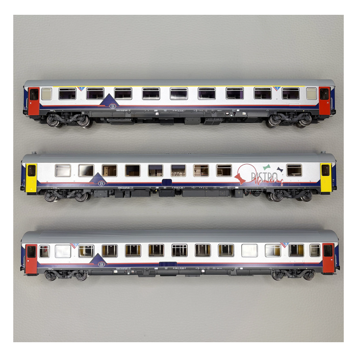 Set di tre carrozze passeggeri I6 + I10 delle Ferrovie belghe SNCB in livrea "Memling" composto da: una carrozza bistrot, una carrozza di prima classe A9 ed una carrozza di seconda classe B11.