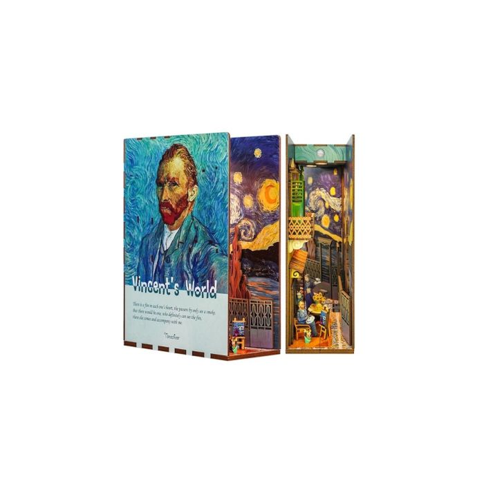 Ispirato ai capolavori di Vincent van Gogh, questo Book Nook mostra una scena in cui van Gogh è seduto in un caffè e dipinge Notte stellata. Davanti a lui, sul tavolo, c’e un vaso con i suoi famosi girasoli. Questo mondo in miniatura, disegnato con amore, cattura la magia e il genio di van Gogh e invita a immergersi nel suo mondo artistico. il kit per Tonecheer Book Nook è dotato di un sensore di luce LED. Quando qualcuno si avvicina all’angolo del libro, la luce si accende automaticamente. Con l’interruttore a LED incluso nel nostro kit fai da te per libri fai da te, il tuo scaffale prenderà vita.