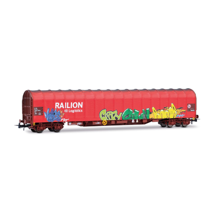 Carro telonato a 4 assi tipo Rils "RAILION DB LOGISTICS" in livrea rossa con graffiti.