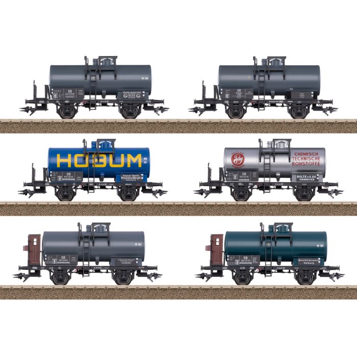 Modello: Carri cisterna con due assi con ruote in esecuzione dettagliata con differenti numeri di servizio, località di residenza e proprietari. Quattro carri con frenatura manuale e piattaforma del frenatore senza garitta del frenatore e due carri con frenatura manuale e piattaforma del frenatore con garitta del frenatore. Dettagliato telaio di rotolamento con struttura traforata. Manovella del freno a mano, impianto del freno e tubi di svuotamento riprodotti dettagliatamente e applicati separatamente. Piattaforma di lavoro con scaletta riportata. Piattaforma del frenatore riportata, con e senza garitta del frenatore. Con agganci corti con guide ad asola. Ciascun carro confezionato singolarmente in una scatola di cartone contrassegnata. Lunghezza ai respingenti di ciascun carro circa 10,1 cm. Asse con ruote a corrente alternata E700150.